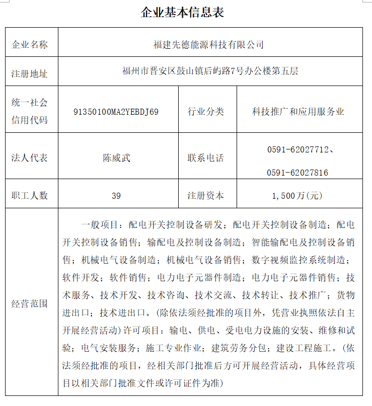 福建先德能源科技有限公司主要从事NEW-12深度融合智能开关、NEU智能配电自动化馈线终端(FTU)、NED智能配电自动化站所终端(DTU)、GZDW直流屏、XJM电能计量箱、XLW低压电缆分支箱、FJXDNY-6000/A12配网智能辅助监控系统的生产及销售。